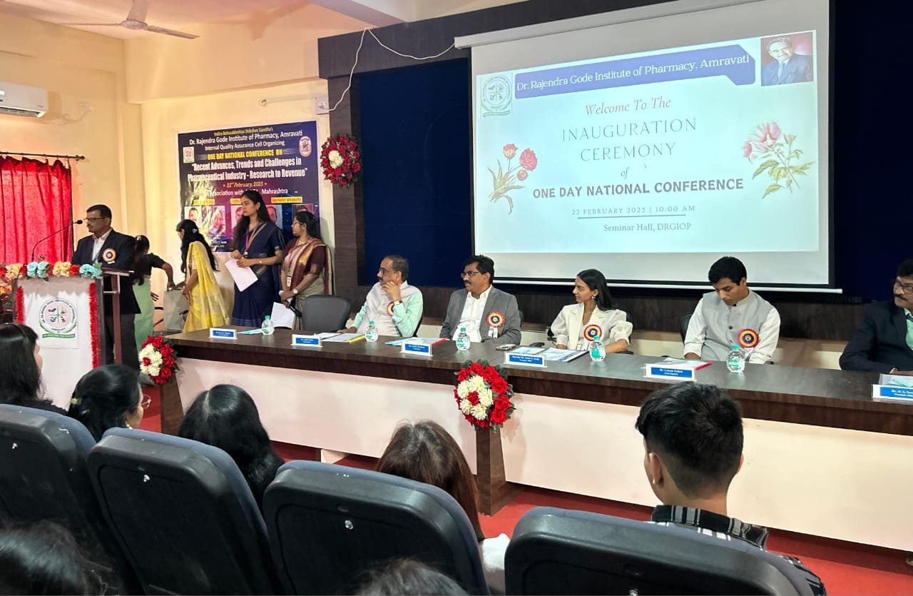 With the inspiration of Hon'ble Chairman Shri Yogendraji R. Gode Sir, Hon'ble Secretary Ms. Tanvi Y. Gode madam and the leadership of Dr. P.V. Burakle Sir, IQAC cell of Dr. Rajendra Gode Institute of Pharmacy, Amravati hosted a One-Day National Conference on ''Recent advances, Trends and Challenges in Pharmaceutical Industry - Research to Revenu'' on 22nd Feb. 2025. The conference was inaugurated in the gracious presence of Hon'ble Tanvi Gode madam, Secretary IBSS. Dr. P. V. Burakle, Principal, DRGIOP, delivered the opening remark about the conference. At this moment chief guest Dr. Anil M. Manikrao, Assistant Commissioner, FDA Maharashtra delivered the keynote address. While addressing in the inauguration ceremony Hon'ble Tanvi Gode madam emphasized the significance of the Indian pharmaceutical industry in the global context, as well as the opportunities and challenges that lie ahead. Dr. H. S. Sawarkar, principal Dr. Rajendra Gode College was also graced the dias at this auspicious occasion. In the morning session Dr. Anil Pethe, Dean, Datta Meghe Institute of Higher Education & Research, Deemed University, Wardha, MS., delivered an insightful session on the latest advancements in pharmaceutical research, highlighting trends like precision medicine, nanorobots, and AI's growing role in drug discovery and development. In the afternoon session Dr. Lokesh Pathak, Co-founder of Nutritional Supplements Company, California, US., delivered talk on translating pharmaceutical research into profitable commercial ventures. Following the speaker sessions, the conference hosted a vibrant poster presentation competition where students and professionals presented their research work, showcasing innovative solutions and cutting-edge developments in pharmaceutical sciences. Participants displayed their research findings in areas such as drug delivery systems, biopharmaceuticals, and sustainable pharmaceutical practices. The conference concluded with an award ceremony where winners of the poster presentation competition were felicitated. Overall, 178 delegates registered for the conference across India.