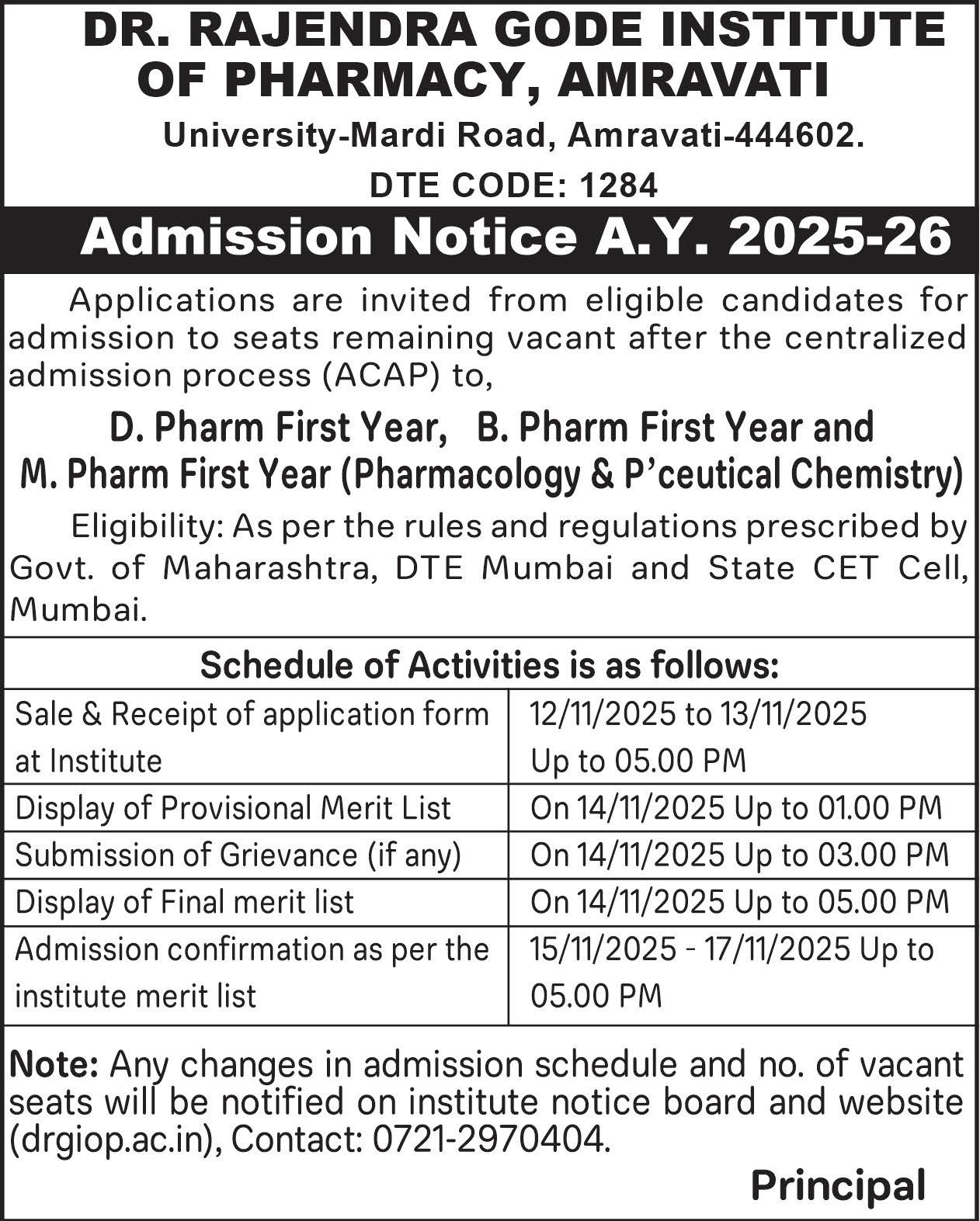 D. Pharm., B. Pharm, M. Pharm. First Year Admission